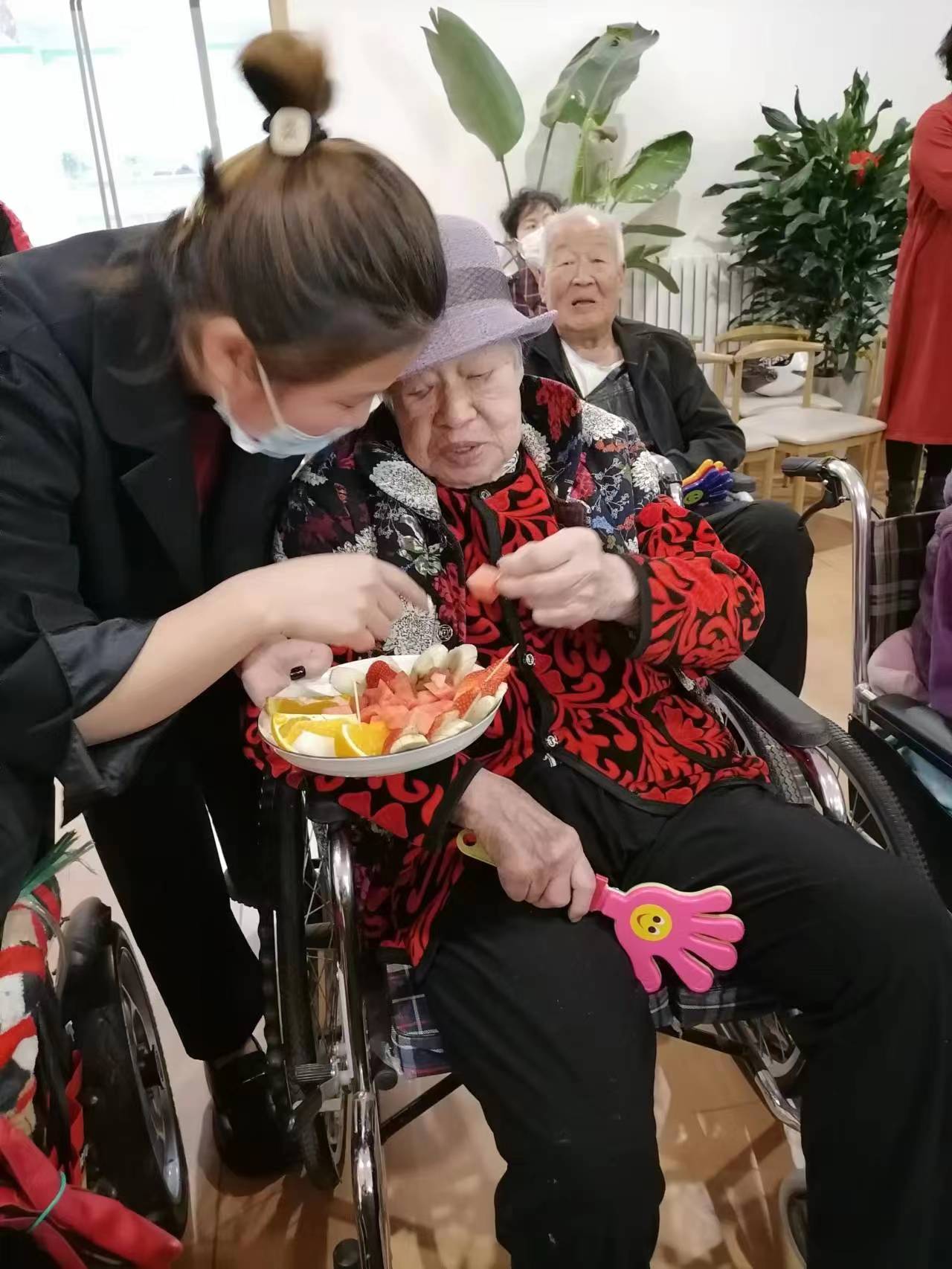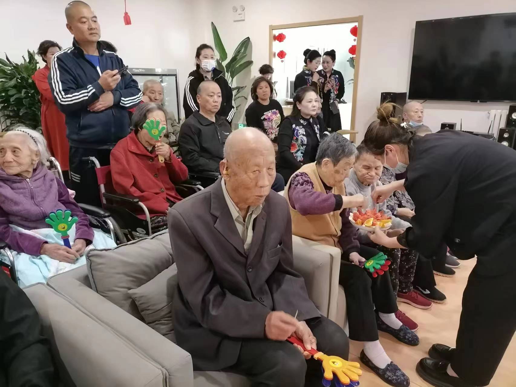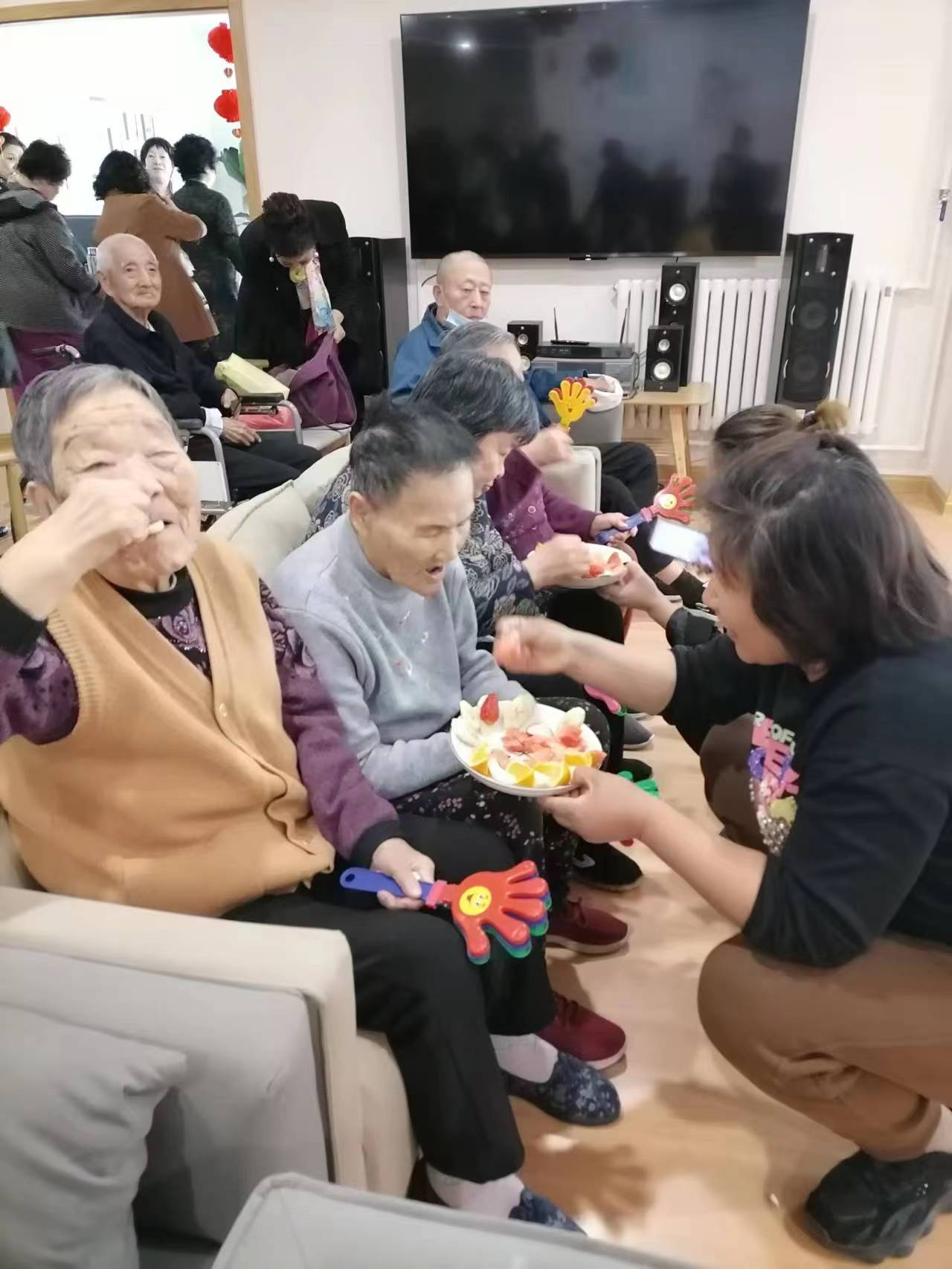 陶乐养老沧州南湖颐养中心的劳动节活动举办得红红火火。活动在下午进行,午睡后的爷爷奶奶们精神矍铄,在护理部孟主任的组织下来到了一楼活动厅,工作人员还为大家准备了水果等小食,让长者们有吃有玩,开启欢乐活动的序幕。