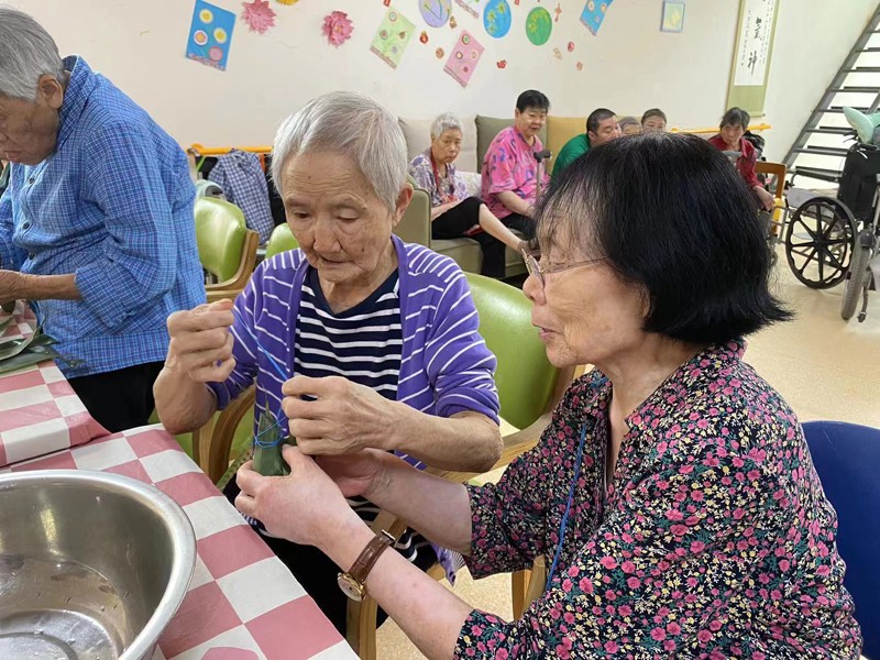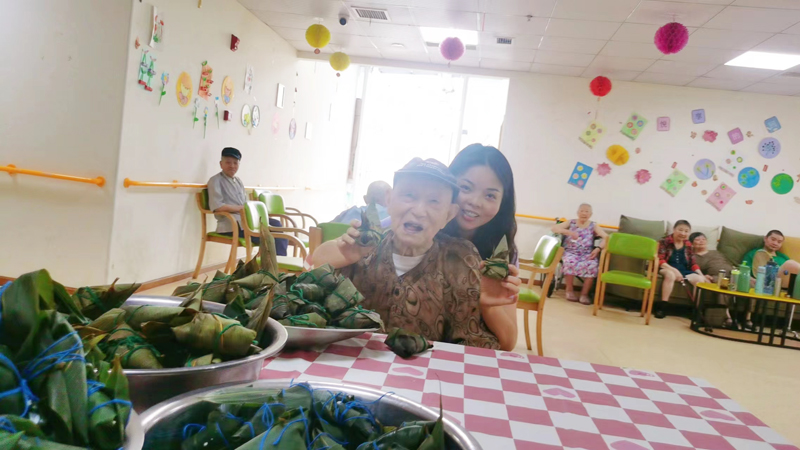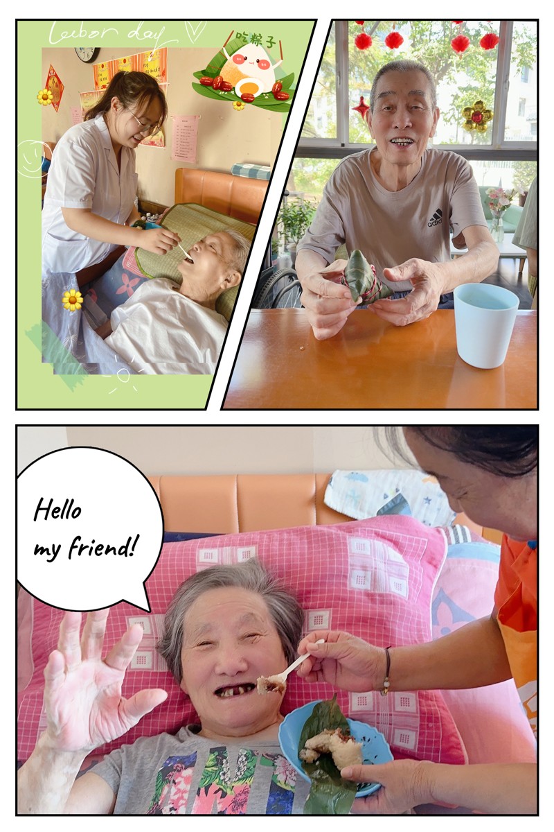 刚出炉的粽叶飘出阵阵香气,软糯的粽子让人爱不释手,工作人员根据长者自身身体情况,将粽子送到长者口中,一起分享这份节日的惬意。