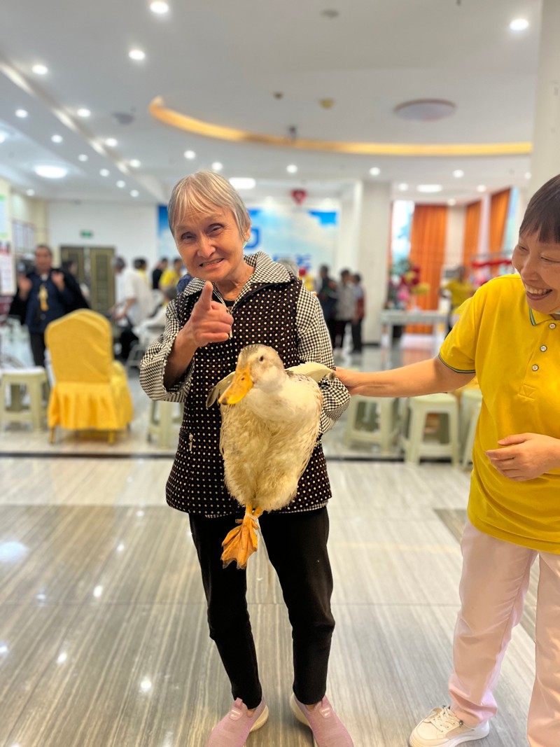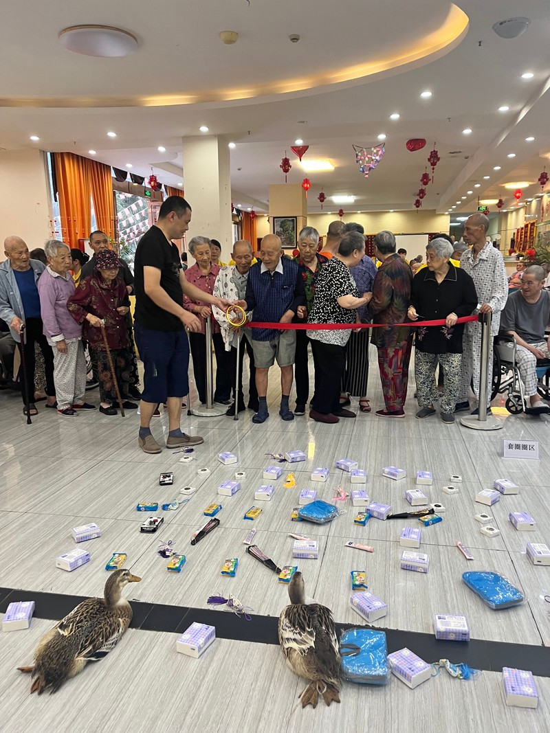 阵阵欢笑来自套圈区,有位奶奶套中了一只鸭子,引得全场祝贺好彩头,奶奶开心得喊来家属将鸭子拿回去煲汤。