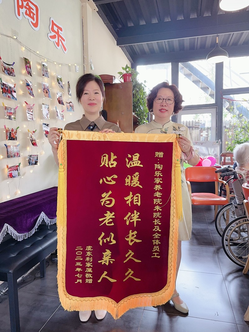 很多家属也来到了庆祝现场,院里于爷爷的女儿代表家属表示了对长者们的祝福,并表示陶乐养老工作人员耐心、用心、爱心的服务态度,让家属特别的放心,送上了一面锦旗表达感谢。