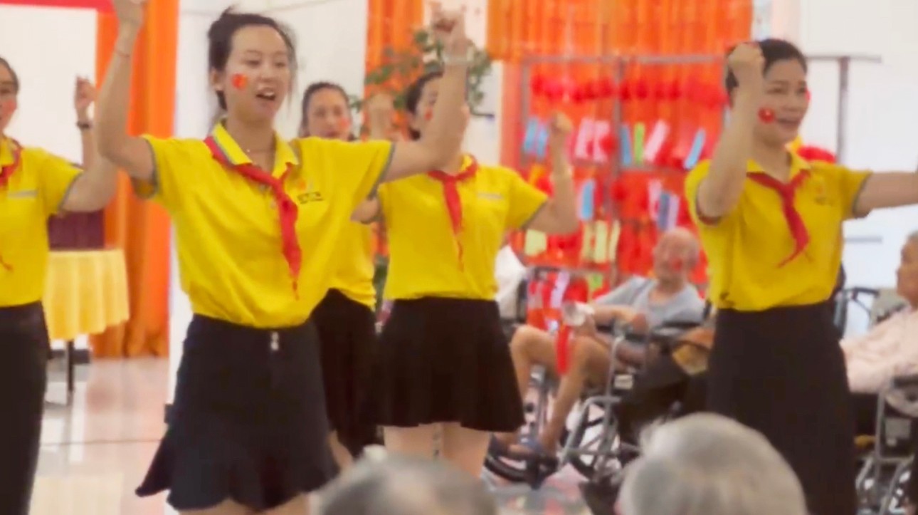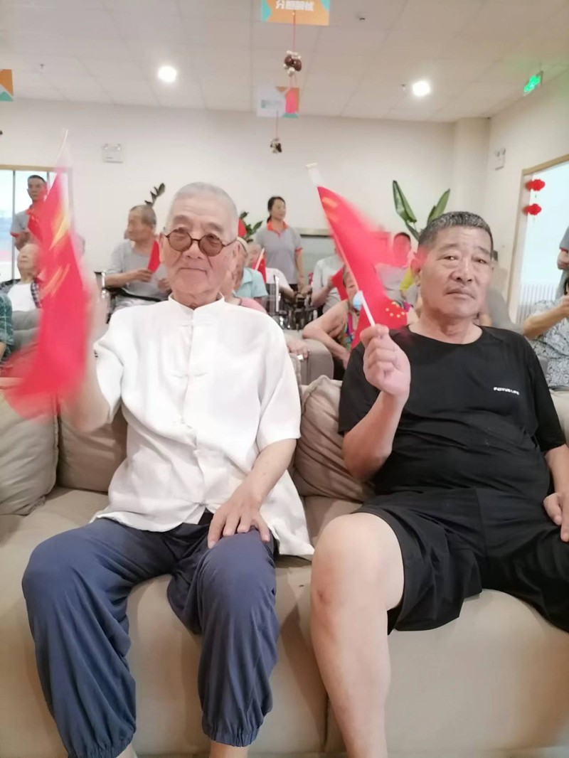 长者们合唱了一曲《打靶归来》,每位参与者都铿锵有力、气宇轩昂,唱出了精气神。富顺东双医养的工作人员也表演了手指舞《团结就是力量》,致敬院内的老兵以及所有为我们抛头颅洒热血的战士们。