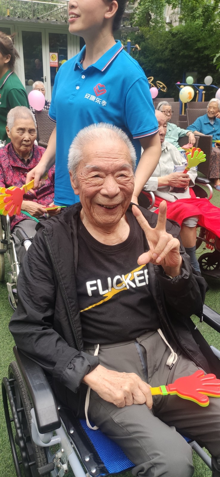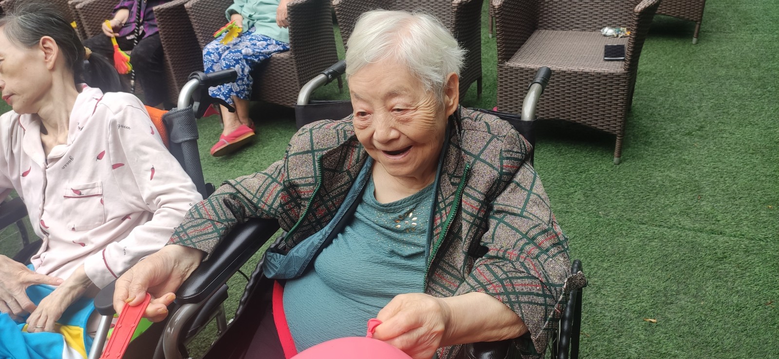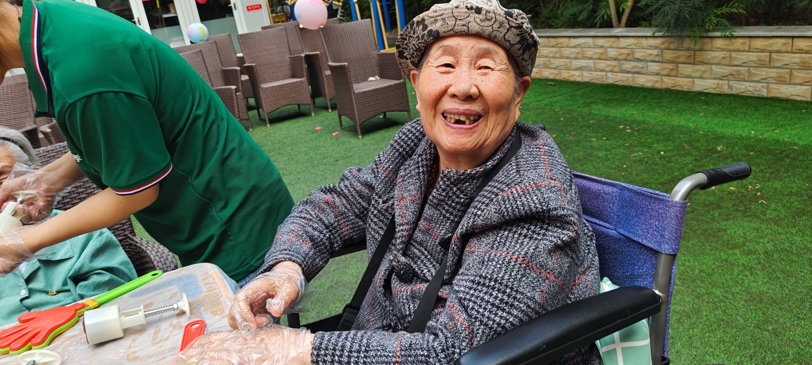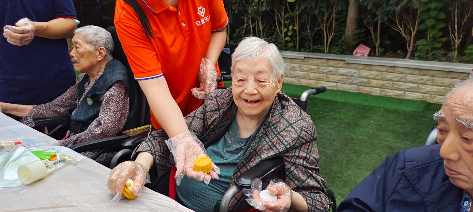 双节期间正是秋高气爽气候的宜人季节,安康乐孝康养中心的户外庭院正好合适让爷爷奶奶们享受这份假日的惬意。