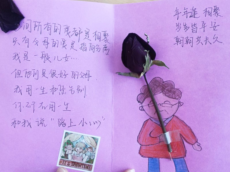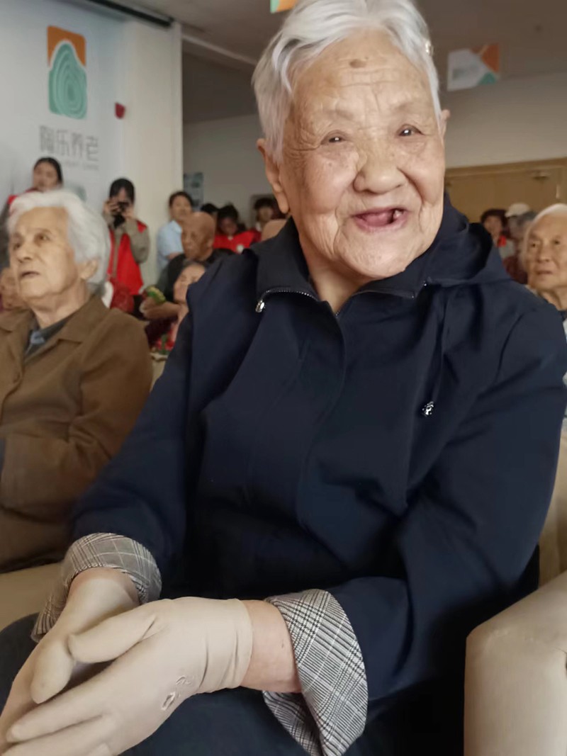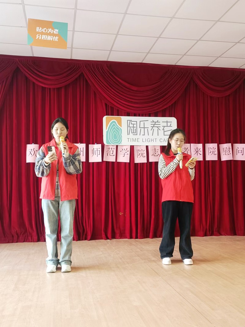 在演出过程中,大学生们还与长者们进行了亲密的互动,他们为爷爷奶奶们准备了精美的贺卡,亲笔写上祝福的话语,表达了对长辈的敬意和关爱。长者们也积极参与其中,与大学生们共同表演节目,分享欢乐时光。