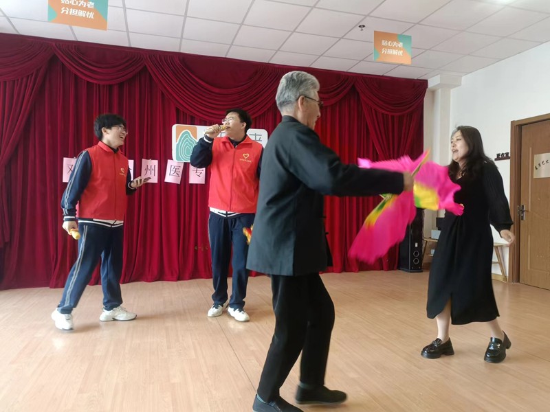 最为热闹的时刻莫过于学生们演唱最炫民族风。爱唱爱跳的吴爷爷和护理主任不甘示弱,上台助兴。他们跳起了欢快的秧歌舞,与学生们一起互动,将整个活动的气氛推向了高潮。原本还有些害羞拘谨的学生们,在吴爷爷和护理主任的感染下,也逐渐放开了自己,与大家一起欢快地跳起了舞。