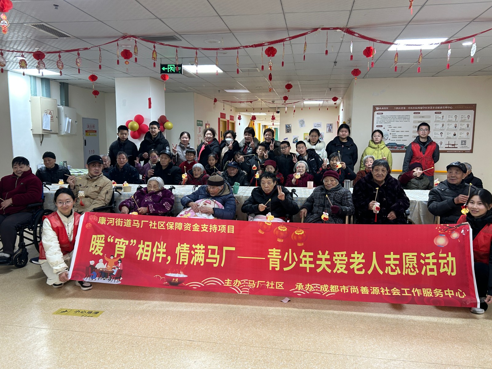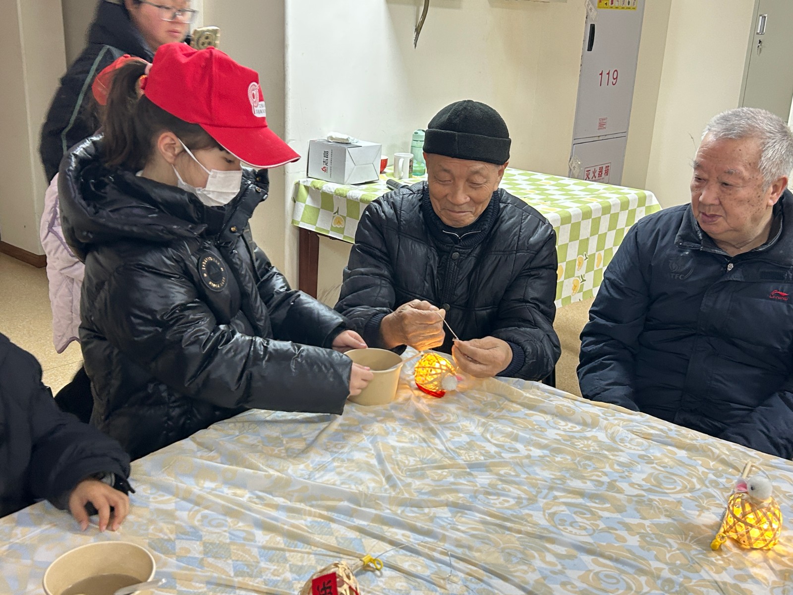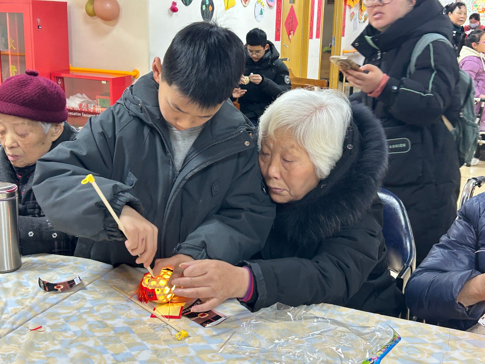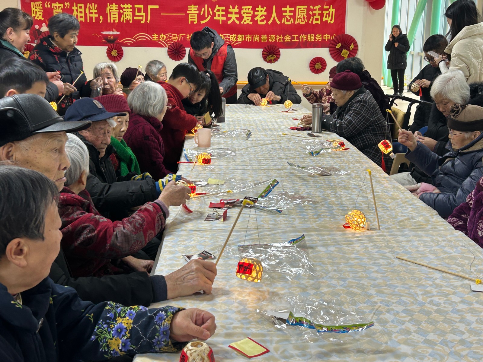 在拾智养老的院内,志愿者少年们的到来给爷爷奶奶们带来了欢喜和生命力,灵巧的双手与长者的苍劲掌纹交织,一盏盏彩纸灯笼渐次绽放,代际交融的暖流中,传统手艺与人间温情悄然传承。