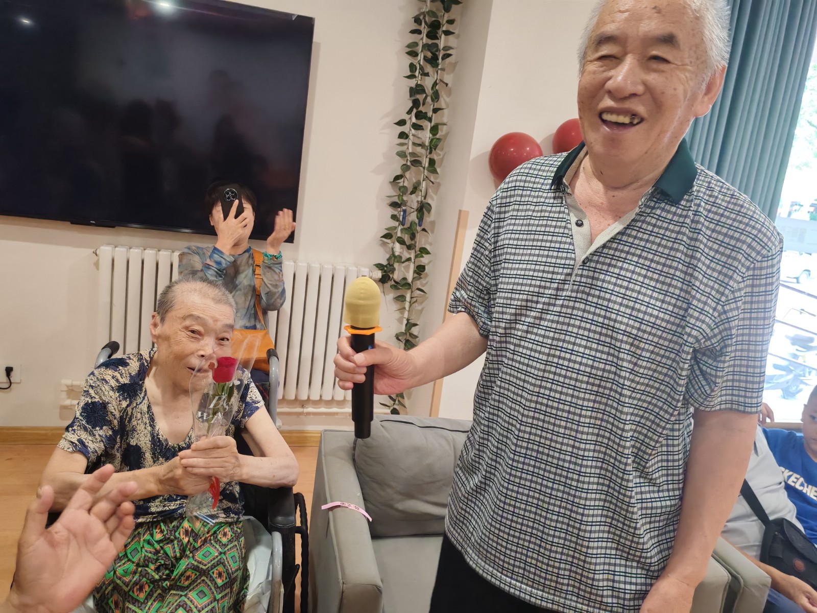 活动伊始,院里的夫妻们在红色幕布下拍照留念,记录下这美好的一刻。随后,节目活动精彩上演:爱的华尔兹开场舞浪漫优雅,夫妻、长者、家属员工共同表演的三句半逗趣横生,家属献唱《搀扶》歌曲深情动人,还有传统戏曲表演韵味十足。