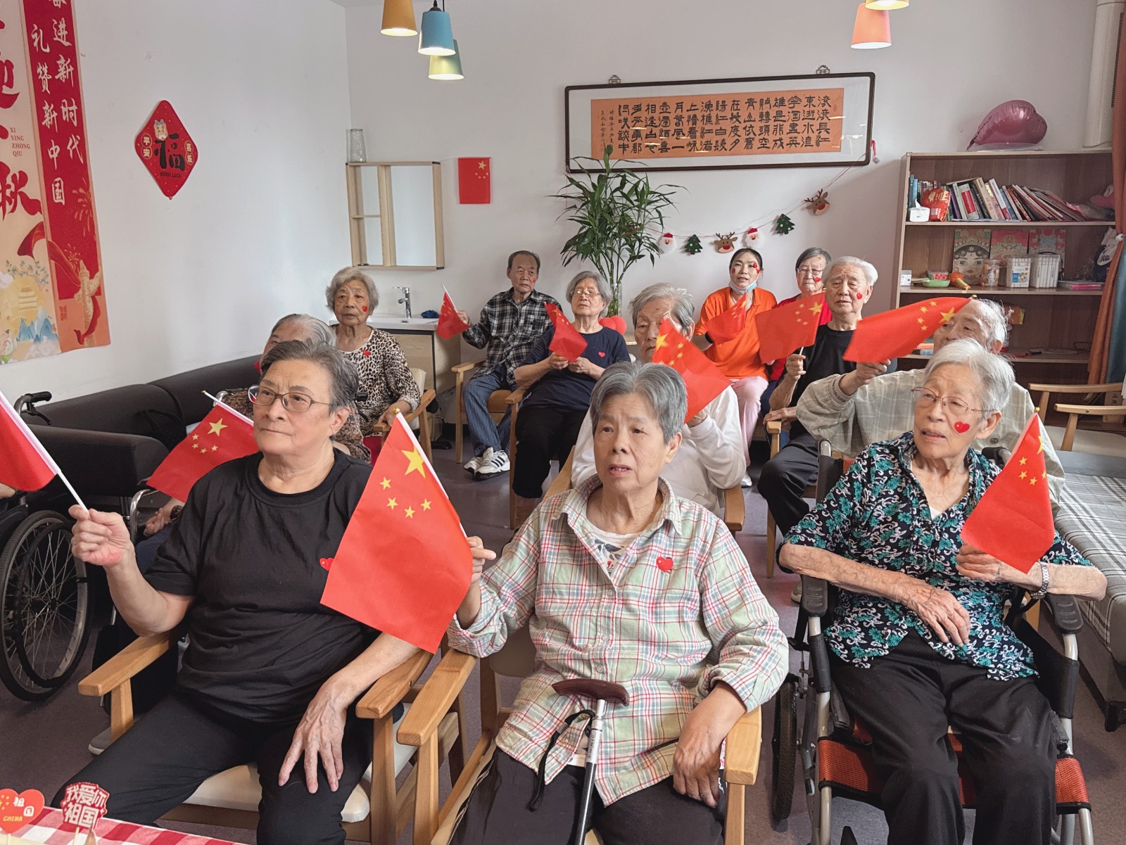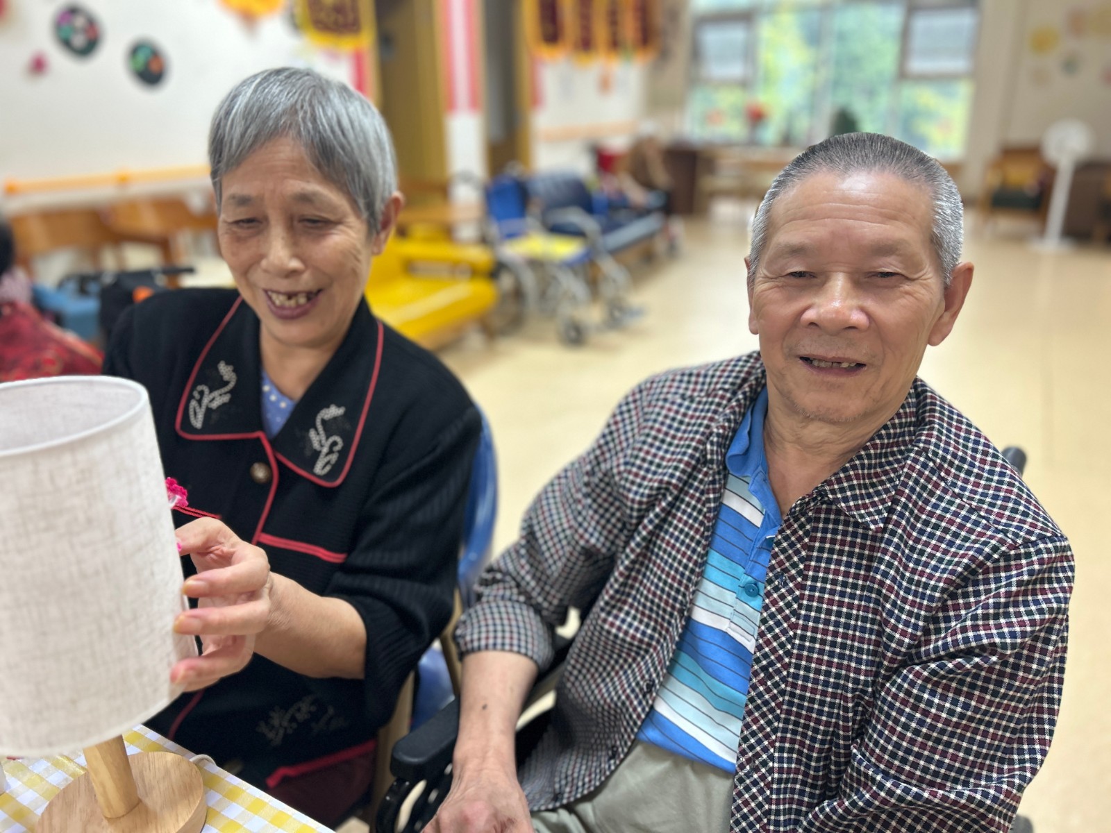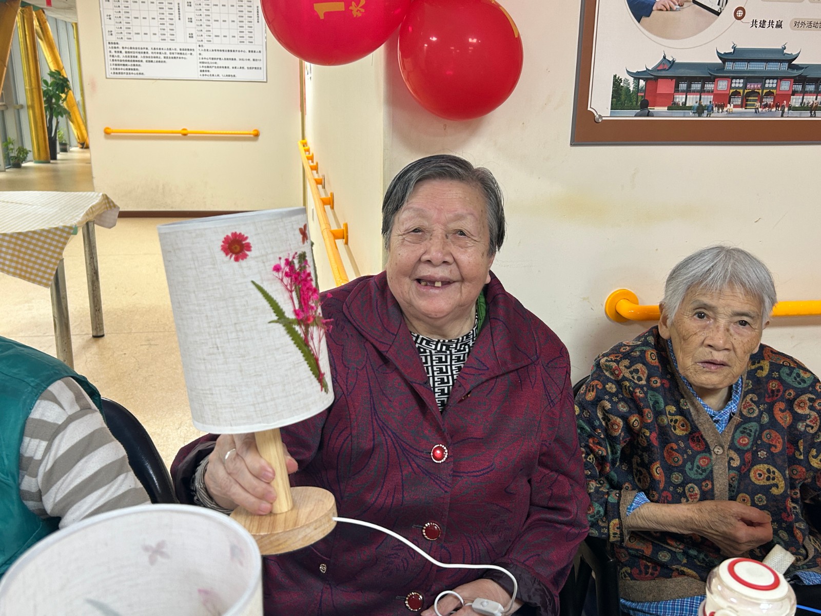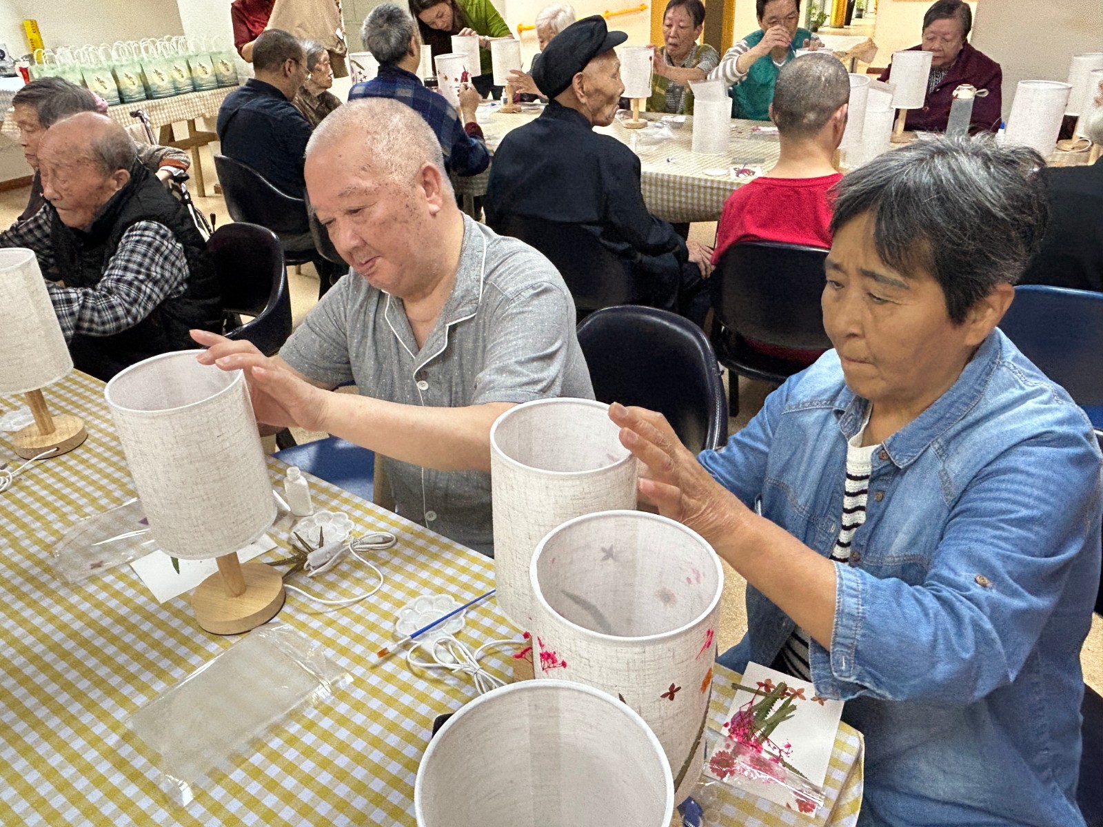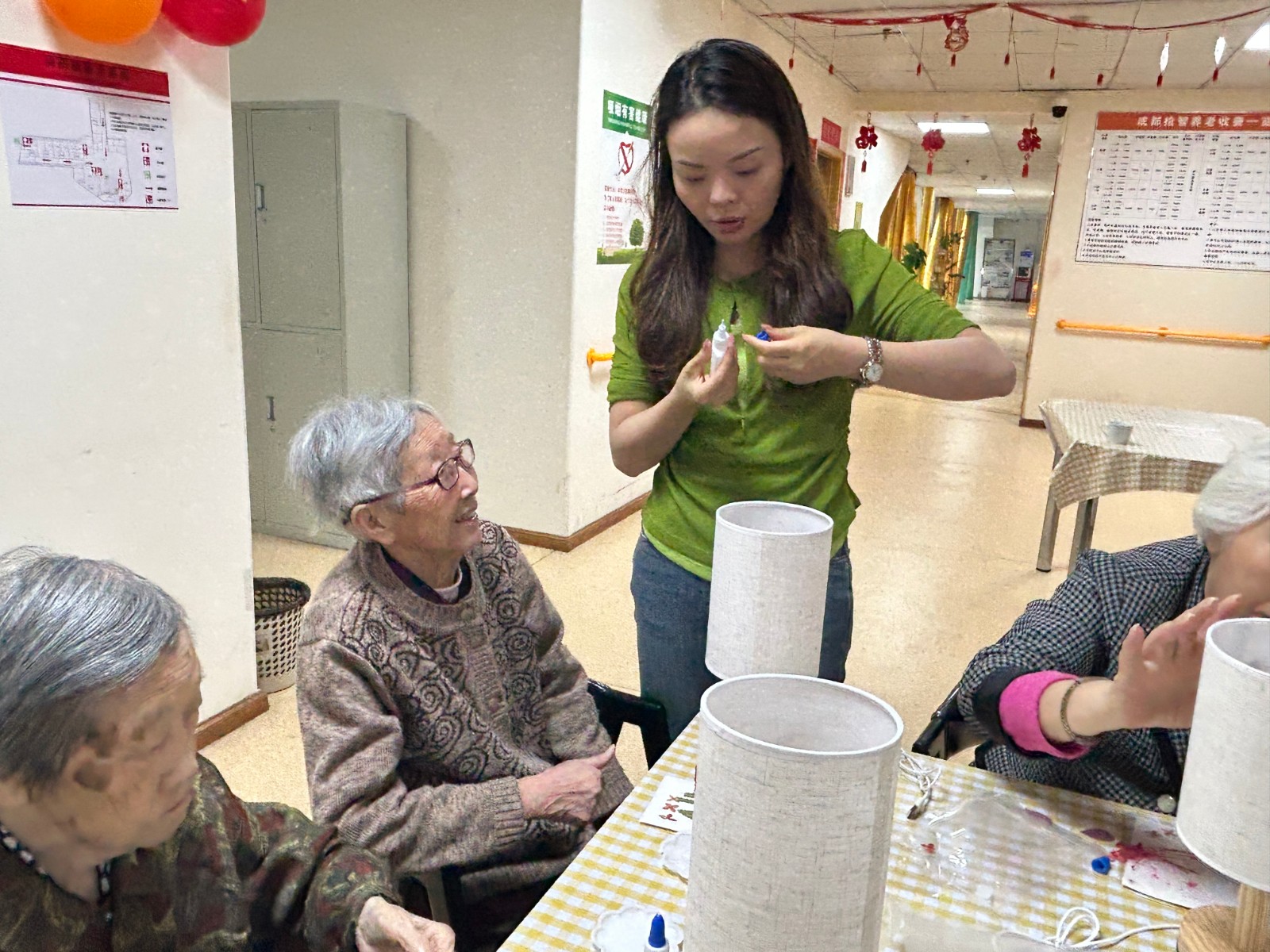 成都拾智养老的中秋国庆双节庆祝活动格外热闹。工作人员带着爷爷奶奶一起挥舞国旗高声歌唱,嘹亮的歌声传递着对祖国的深情祝福。此外,院内还开展了主题手工活动,张院长与爷爷奶奶们一起动手用干花制作手工台灯。一盏盏独具匠心的台灯,照亮了节日的夜晚,也温暖了长者们的心房。
