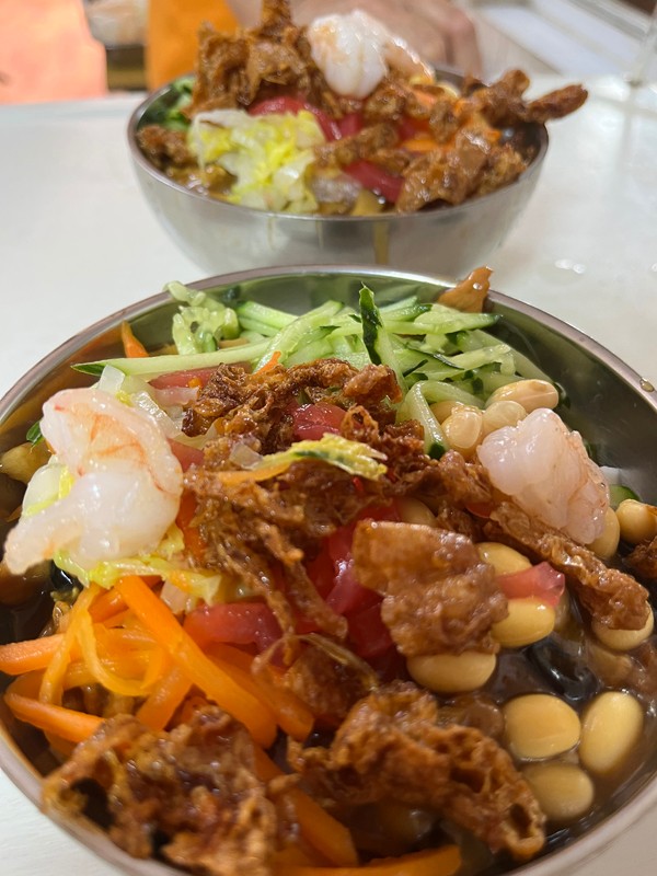 午饭的重头戏必须是津味儿传统捞面,因为院内大部分爷爷奶奶都是天津人,所以厨师也将这碗生日面做的特别地道!红粉皮儿捞面是天津特色,菜码齐全、糖醋面筋、虾片都是最悠远的美好回忆。工作人员一边给长者们盛面、端面,一边笑着小声哼着歌,处处洋溢着对陶乐大家庭的热爱和认可。