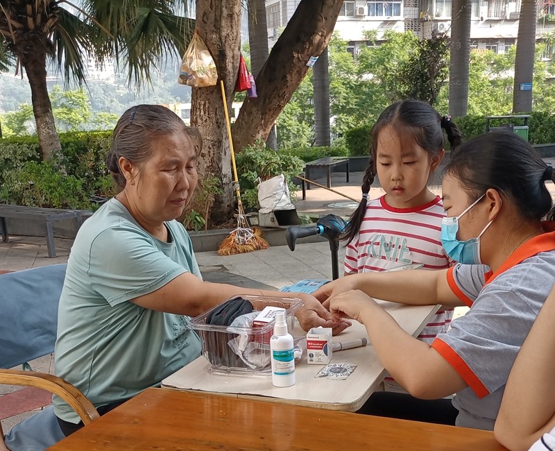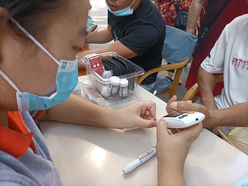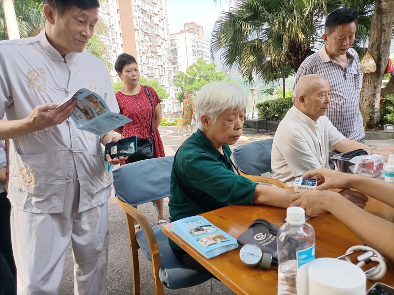 活动从早上9点一直持续到中午11:00,前来问询的老人络绎不绝,有很多长者自己测量血压、血糖之后,又喊来了邻居,甚至喊来了别的社区的长者一起做健康咨询。