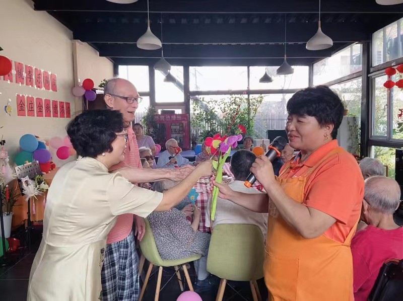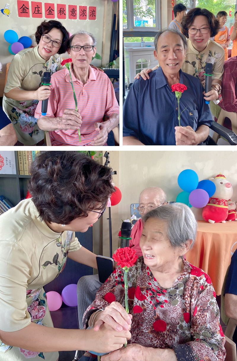 节日和鲜花总是更配的,收到鲜花作为礼物的长者们,笑得合不拢嘴。