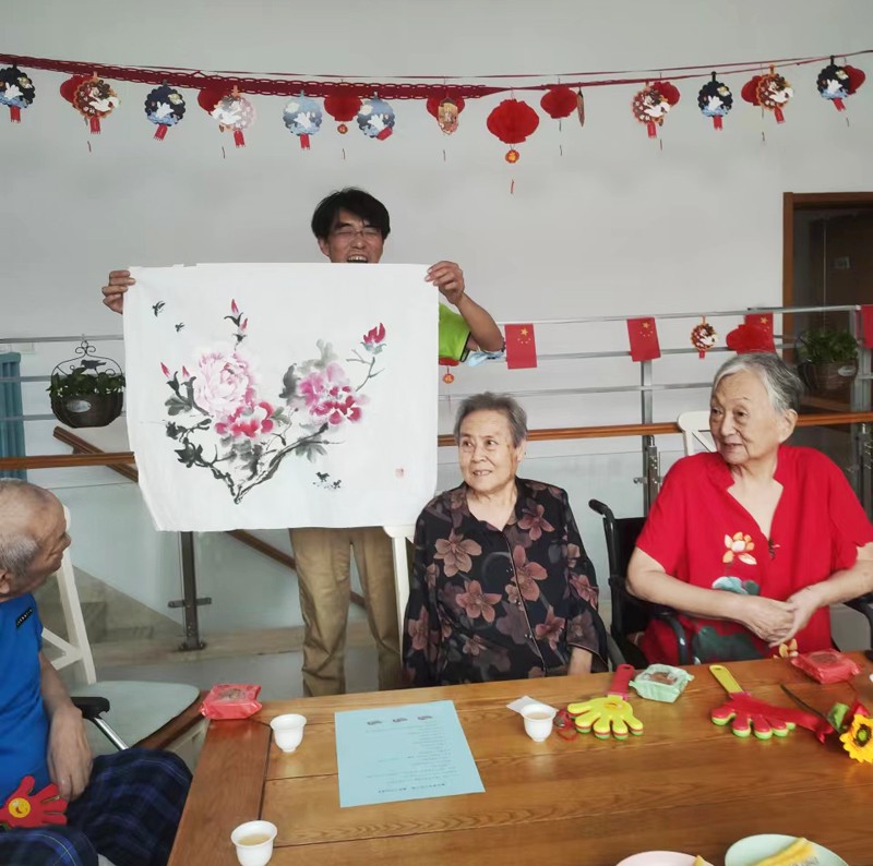 活动中院里的奶奶展示并送给院内自己的国画,赢得阵阵掌声。