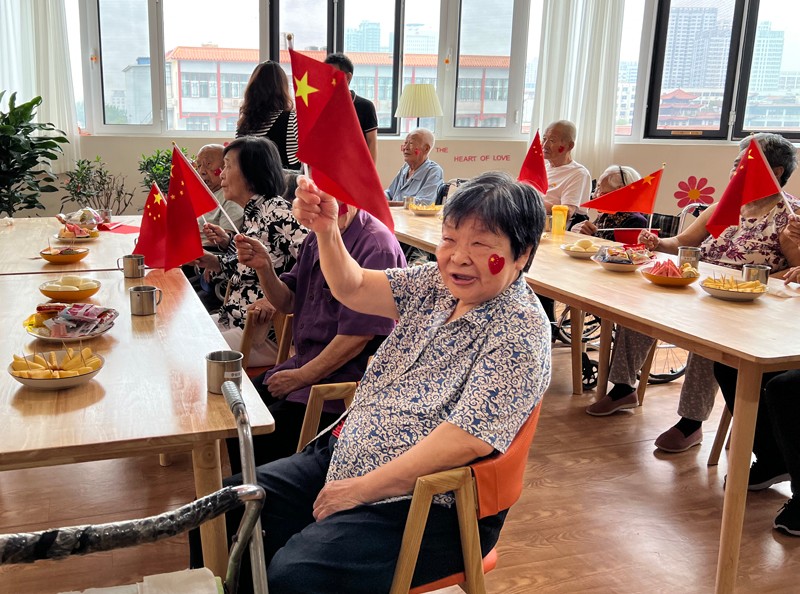 一抹抹中国红在院里流淌,长者和工作人员一起,以我们自己的方式,为祖国庆生。
